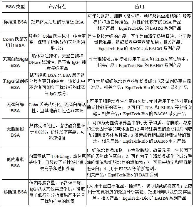 牛血清白蛋白Albumin from bovine serum,BSA,又稱為組分V或Cohn V,名稱起源于BSA的分餾法——Cohn 冷乙醇法, Cohn 冷乙醇法是由哈佛大學(xué)Edwin Cohn教授于1946年發(fā)明的。當(dāng)時(shí)基于戰(zhàn)爭(zhēng)創(chuàng)傷治療對(duì)注射級(jí)別蛋白的大規(guī)模需求,Cohn教授在較低的溫度下改變血漿的乙醇濃度和pH值,使其所含蛋白在不同乙醇濃度下析出,在第五個(gè)析出的組分中主要成分為BSA,所以BSA又稱組分V或Cohn V。Cohn法仍然是目前非常普遍的BSA分餾法。 美國大的生物原材料供應(yīng)商Equitech-Bio提供經(jīng)典冷乙醇法和先進(jìn)的熱休克法純化的高質(zhì)量、分類齊全的BSA,助力您的實(shí)驗(yàn)!