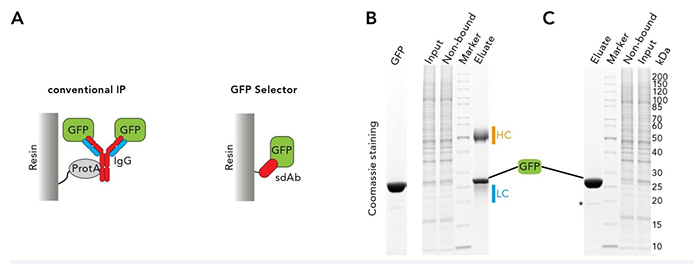 傳統(tǒng)的GFP融合蛋白免疫沉淀是基于與GFP特異性抗體非共價鏈接的protein A或protein G結(jié)合在固相,從而拉下蛋白的原理(見圖1 A),其產(chǎn)率和效率通常受限于一抗的特異性和固相上protein A/G的結(jié)合能力。通常,在用SDS緩沖液洗脫時,抗體發(fā)生變性并與GFP融合蛋白及相互作用的配體一起從樹脂上分離下來。因此,洗脫液中通常含大量一抗重鏈和輕鏈見圖1 B,妨礙鑒定蛋白的相互作用,還有可能影響下游實驗,比如蛋白質(zhì)印跡或質(zhì)譜分析。