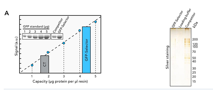 • 將相同體積的GFP selector和競爭產(chǎn)品分別與不含任何GFP標記蛋白的HeLa裂解物一起孵育,洗滌后,產(chǎn)物通過SDS-PAGE分離并進行銀染色分析。