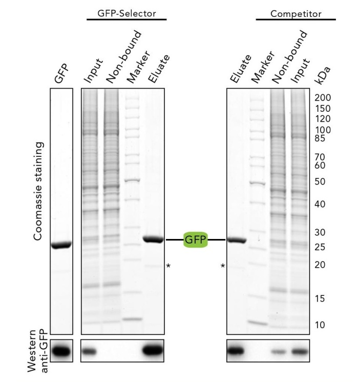 • 將等量GFP Selector和競爭產(chǎn)品與1ml含GFP標記蛋白的HeLa裂解物一起孵育,通過考馬斯染色和蛋白印跡分析上樣、洗滌產(chǎn)物、洗脫產(chǎn)物。