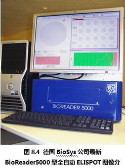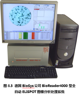 德國Bio-Sys公司從上世紀(jì)80年代開始就致力于生物圖像識別領(lǐng)域,在進(jìn)入ELISPOT圖像分析儀市場后一直以其先進(jìn)的ELISPOT斑點(diǎn)識別技術(shù)聞名。德國Bio-Sys公司首先解決了顯微攝像系統(tǒng)難以定位96孔板上的每一個孔的問題。其解決方法基于圖像識別技術(shù),利用板孔邊壁和真正的孔底的細(xì)微差別,在機(jī)械定位的基礎(chǔ)上,通過軟件識別來進(jìn)一步提高每孔的定位精度。是目前市場上所有ELISPOT圖像分析儀中唯一能夠完整識別整個孔底ELISPOT斑點(diǎn)圖像的設(shè)備。在對真假斑點(diǎn)的分辨中,德國Bio-Sys公司除了具備完善的物理學(xué)多參數(shù)識別技術(shù),還特別針對ELISPOT斑點(diǎn)形成的生物學(xué)過程,通過細(xì)胞因子顯色后的“光密度”峰值積分分析方法,精確分辨真假斑點(diǎn)、融合斑點(diǎn)等復(fù)雜情況。Bioreader系列ELISPOT圖像分析儀國外大多數(shù)較有經(jīng)驗(yàn)的ELISPOT實(shí)驗(yàn)室推崇的特點(diǎn)為:專業(yè)性和參數(shù)全開放性。因?yàn)镋LISPOT實(shí)驗(yàn)的復(fù)雜性,ELISPOT斑點(diǎn)形成在不同的實(shí)驗(yàn)條件下有非常大的差異。這就對ELISPOT圖像分析儀提出了較高的要求:既要能夠保證斑點(diǎn)計(jì)數(shù)的真實(shí)性和一致性,又要能夠根據(jù)不同情況,通過實(shí)驗(yàn)者的判斷來校正儀器對ELISPOT斑點(diǎn)識別的標(biāo)準(zhǔn)。要同時實(shí)現(xiàn)以上兩個要求,唯一的辦法是將儀器的所有判斷標(biāo)準(zhǔn)向ELISPOT實(shí)驗(yàn)者開放,實(shí)現(xiàn)實(shí)驗(yàn)者和儀器的互動。在這一方面,德國Bio-Sys公司始終走在ELISPOT斑點(diǎn)識別領(lǐng)域的前列,新的Bioreader-4000型(圖8.3)和Bioreader -5000(圖8.4) 型在專業(yè)性和適用性方面都領(lǐng)先于其他廠家的設(shè)備。