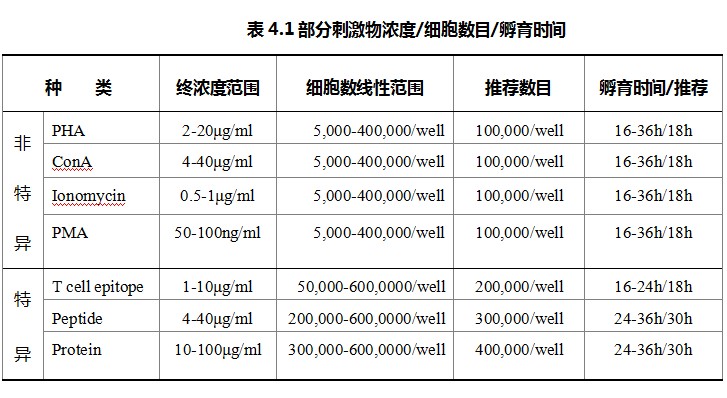 不論是普通多肽(比如重疊多肽庫(kù))還是蛋白質(zhì)或者蛋白類(lèi)的組織提取物,這些刺激物都需要APC的攝取、內(nèi)化、加工、呈遞,之后T細(xì)胞才能被刺激。所以,使用這些刺激物的時(shí)候,一定要保證足夠的細(xì)胞密度。根據(jù)我們的經(jīng)驗(yàn),細(xì)胞密度要至少達(dá)到20萬(wàn)-30萬(wàn)每孔。多肽推薦的細(xì)胞密度為30萬(wàn)/孔,蛋白推薦的細(xì)胞密度為40萬(wàn)/孔。也可以根據(jù)實(shí)際情況,在線性范圍內(nèi)調(diào)整,參見(jiàn)表4.1與圖4.2。