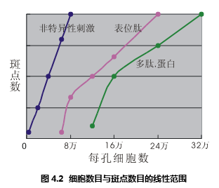 非特異性的刺激物可以直接刺激淋巴細(xì)胞,這種刺激不依賴(lài)于APC或者其它輔助細(xì)胞,是單細(xì)胞反應(yīng)行為。所以它對(duì)細(xì)胞密度沒(méi)有要求,在極寬的細(xì)胞濃度范圍之內(nèi)——多至40萬(wàn)/孔,低至5千/孔——斑點(diǎn)數(shù)量和細(xì)胞數(shù)量都有簡(jiǎn)單的正比例關(guān)系,參見(jiàn)圖4.2。但是考慮到,只有恰當(dāng)?shù)陌唿c(diǎn)數(shù)目才便于數(shù)據(jù)統(tǒng)計(jì),所以推薦細(xì)胞密度為10萬(wàn)/孔。如果細(xì)胞數(shù)目過(guò)多,滿孔都會(huì)被斑點(diǎn)覆蓋,并且相互重疊。