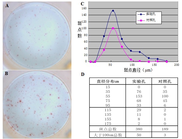 由于有了充足的信息與理由,我們可以在最后斑點(diǎn)計(jì)數(shù)的時(shí)候,把斑點(diǎn)直徑的閾值設(shè)定為100μm:我們只計(jì)數(shù)大于100μm的斑點(diǎn),小于100μm的斑點(diǎn)不予計(jì)數(shù)。這樣負(fù)對(duì)照孔與實(shí)驗(yàn)孔的最終結(jié)果為3:50,相差有17倍!這比最初相差一倍的結(jié)果顯著得多。
