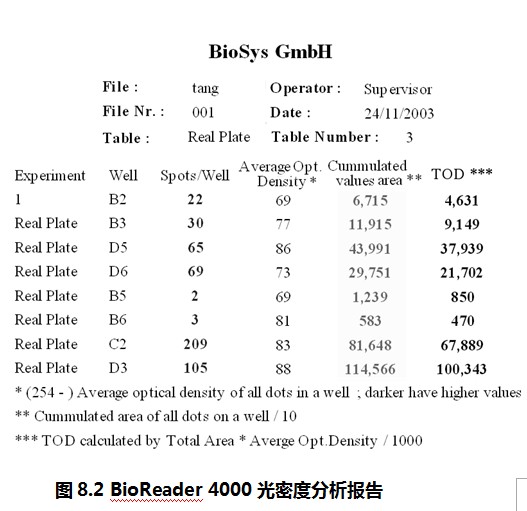 如圖8.2所示,這是BioReader 4000光密度分析報(bào)告。它可以提供的信息有:孔的位置、每孔的斑點(diǎn)數(shù)目、該孔斑點(diǎn)的平均光密度(Average Opt. Density)、該孔斑點(diǎn)的總面積(Cumulated values area)、該孔相對(duì)細(xì)胞因子分泌總量(TOD,即光密度總值)。