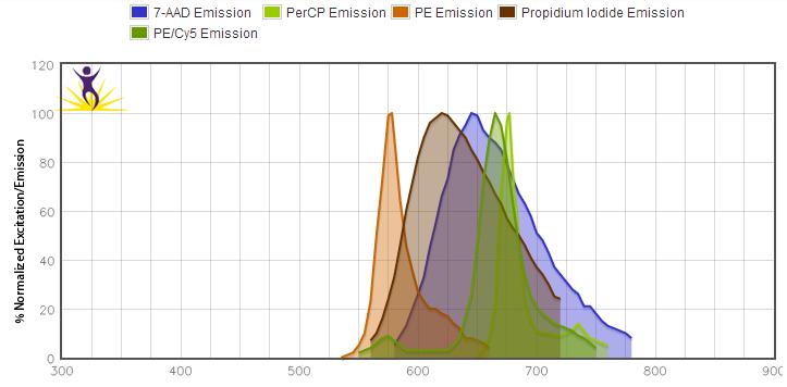 7-AAD、PerCP、PE、PI、PE/Cy5發(fā)射光譜: