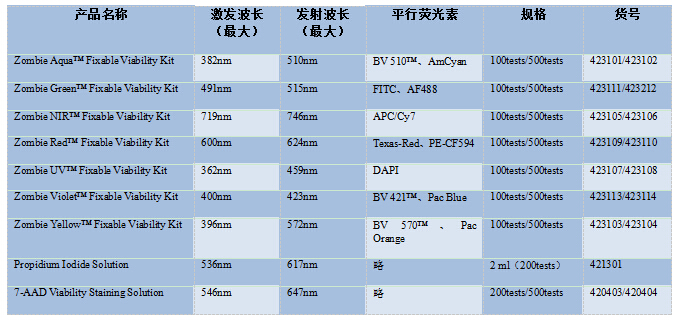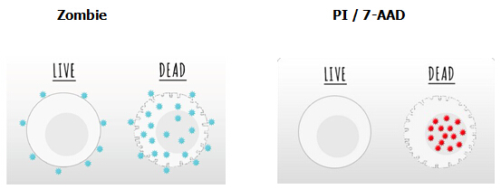 Zombie Dyes有別于PI和7-AAD等DNA染料,它是一種可用于需固定細胞實驗的染料,通過與細胞上蛋白質(zhì)的氨基結(jié)合來實現(xiàn)。因活細胞可排除染料,所以僅細胞膜被著色;而死細胞的細胞膜及細胞質(zhì)均被著色,繼而根據(jù)熒光信號的強弱來區(qū)分死/活細胞。而且Zombie Dyes可選擇性多,可以由不同的激發(fā)光激發(fā),便于靈活選擇。