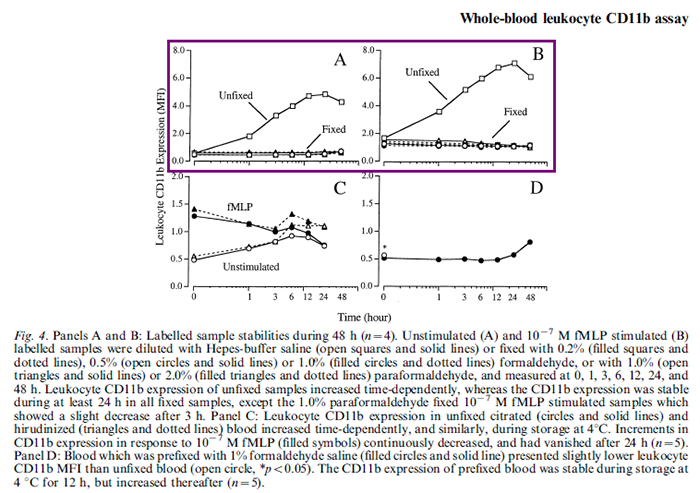 最常見的情況是染色處理完已經(jīng)到很晚,平臺老師已經(jīng)下班或者自己的身體已經(jīng)扛不住通宵做實驗了,這個時候需要對樣本進(jìn)行固定處理,放到第二天檢測,這里的固是定為了保持檢測指標(biāo)的穩(wěn)定性;另一方面,當(dāng)樣本特別多的時候,第一管樣本和最后一管樣本的時間間隔會很久,這種情況下考慮上機(jī)前做一下固定,保持前后數(shù)據(jù)的一致性,比如CD11b這個指標(biāo)在白細(xì)胞中的表達(dá)會隨著樣本放置時間的增加而上調(diào)。