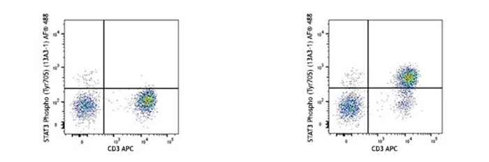 在蛋白翻譯后修飾(磷酸化、乙酰化、甲基化等)的研究過程中,固定劑不僅可以有效的“固定”住翻譯后修飾的位點(絲氨酸、蘇氨酸、酪氨酸等),也可以防止目標(biāo)位點在活細(xì)胞中很快降解(比如磷酸酶會去除磷酸化修飾、去甲基化酶會移除甲基化修飾等)。下面的例子是用IL-6的重組蛋白刺激人外周血15分鐘后看STAT3705位酪氨酸的磷酸化水平,在刺激完樣本后就需要通過固定來實現(xiàn)目的氨基酸磷酸化水平“停留”在IL-6刺激15分鐘這個節(jié)點上。