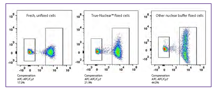 主要表現(xiàn)在固定劑對串聯(lián)染料(tandem-dye,如APC/Cy7、PE/Cy7等)的影響:一個是固定劑有可能造成串聯(lián)染料的斷裂,比如APC-Cy74%多聚甲醛溶液接觸時間超過4個小時染料就有可能斷裂,所以如果細(xì)胞直接重懸在固定液里面建議盡快上機(jī),如果要放到第二天上機(jī),需離心去除固定液后重懸在流式染色液或者是PBS里面,當(dāng)然有一些新的串聯(lián)熒光素可以有效減少這種情況,比如BioLegendAPC/Fire750TM染料。