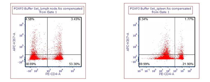 BioLegend FOXP3 Buffer set對細(xì)胞進(jìn)行固定破膜處理后,染Ki-67抗體,左圖:小鼠淋巴結(jié)樣本;右圖:小鼠脾臟樣本。
