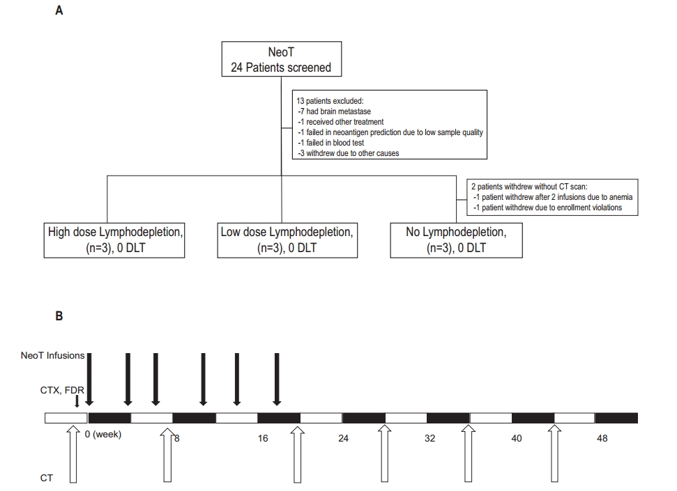 針對(duì)這些問題,中山大學(xué)徐瑞華團(tuán)隊(duì)在2023年6月10日發(fā)表了題為“A pilot study of lymphodepletion intensity for peripheral blood mononuclear cell-derived neoantigen-specific CD8+ T cell therapy in patients with advanced solid tumors”的研究論文。該研究開發(fā)了一種從癌癥患者的外周血單個(gè)核細(xì)胞(PBMCs)中產(chǎn)生個(gè)性化Neo-T(新抗原特異性CD8+ T細(xì)胞)的方法。作者建立了一個(gè)流程,包括通過生物信息學(xué)分析預(yù)測(cè)新抗原,并在25天內(nèi)大規(guī)模擴(kuò)增新抗原特異性T細(xì)胞。為了評(píng)估Neo-T治療的臨床療效并確定Neo-T治療的最佳淋巴細(xì)胞耗竭強(qiáng)度,作者進(jìn)行了一項(xiàng)首次在人體中使用氟達(dá)拉濱和環(huán)磷酰胺增加劑量的Neo-T治療的研究。該研究是一項(xiàng)開放標(biāo)簽I期臨床試驗(yàn)(NCT02959905),包括標(biāo)準(zhǔn)治療難治的局部晚期或轉(zhuǎn)移性實(shí)體瘤患者。