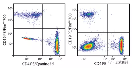 在5激光Cytek? Aurora 光譜流式平臺(tái)上,檢測(cè)人裂紅后外周血的CD4和CD19。PE/Fire? 700-CD19和PE/Cyanine5.5-CD4共染方案與PE/Fire? 700-CD19和PE-CD4共染方案得到了相似得陽性信號(hào),說明在光譜流式平臺(tái)PE/Fire? 700和PE/Cyanine5.5是有可能在一個(gè)panel中共用的,但是配色方案可以更加優(yōu)化。