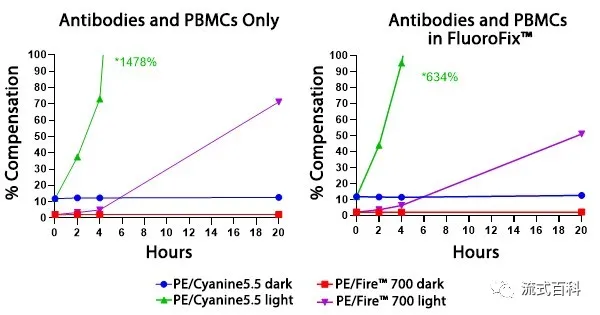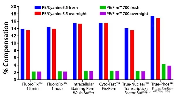 PE/Fire? 700 和PE/Cyanine5.5標(biāo)記的兩種CD4抗體檢測(cè)人裂紅外周血,抗體孵育完成后在固定洗滌馬上去檢測(cè)條件下和過夜后的條件下,在5激光Cytek? Aurora 光譜流式平臺(tái)檢測(cè),PE/Fire? 700 在不同的實(shí)驗(yàn)方案中對(duì)多聚甲醛的固定具有穩(wěn)定的抗性,表現(xiàn)出比PE/Cyanine5.5更優(yōu)秀的穩(wěn)定性,但是在磷酸化指標(biāo)的檢測(cè)方案中,PE/Fire? 700熒光素的穩(wěn)定性出現(xiàn)了一定程度的下降。