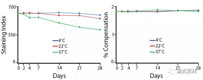 將PE/Fire? 700標(biāo)記的抗體分裝后分別保存在4℃、22℃和37℃下。穩(wěn)定性可以根據(jù)抗體的染色指數(shù)(staining index)和熒光補(bǔ)償百分比來衡量,隨著保存時(shí)間的延長,3種溫度保存條件下光補(bǔ)償百分?jǐn)?shù)并沒有發(fā)生改變,但是37℃的保存條件染色指數(shù)下降了約36%,22℃保存條件的染色指數(shù)下降了約12%,這主要是由于這兩種保存條件下抗體的非特異性染色背景升高引起的(檢測(cè)平臺(tái)為5激光Cytek? Aurora 光譜流式)。