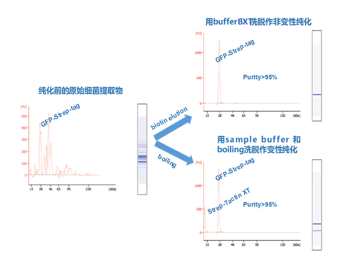 使用Agilent Bioanalyzer 2100 System分析提取出來(lái)的蛋白,發(fā)現(xiàn)不管是直接以Buffer BXT (含Biotin)將靶蛋白洗脫下來(lái),或是加入sample buffer煮沸來(lái)分離目標(biāo)蛋白,都能得到高純度的蛋白。
