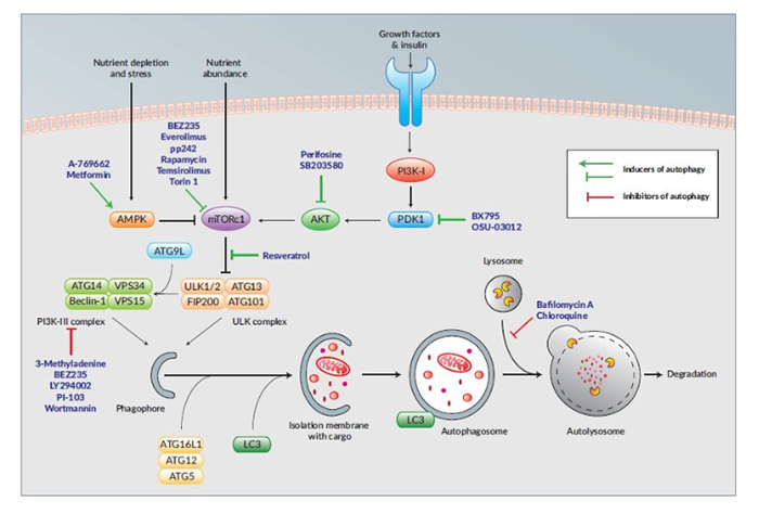 自噬是原生分解程序,由細胞內應激物(營養(yǎng)物和能量貧乏)引起。自噬由生成自噬體開始,這一步驟由一系列蛋白調控,包括VPS34的Ⅲ型磷脂?;迹?/span>PI)3激酶復合體,隨后與溶酶體的融合將自噬體酸化。自噬的阻斷有多種形式,例如Ⅲ型PI3激酶抑制劑可通過抑制自噬捕獲動作而阻斷自噬進程,或者用抑制溶酶體酸化的抑制劑阻止自噬溶酶體的形成和自噬降解。自噬進程是被縝密調控的。mTORC1,一種對營養(yǎng)物和生長因子敏感的激酶,是自噬的主要阻遏器。因此,mTORC1及其信號通路的抑制劑可誘導產生自噬。